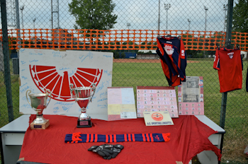 cimeli delle battaglie sportive rossoblu, tra i quali i primi cartellini